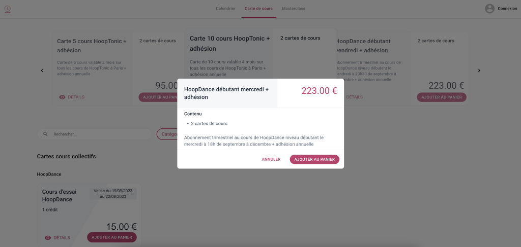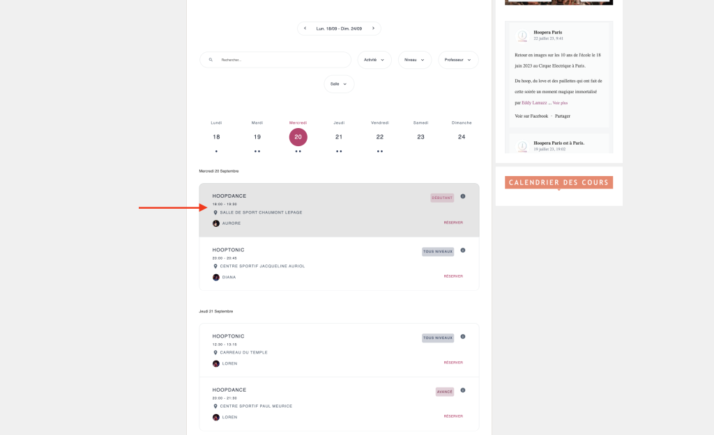 Sélectionnez le cours auquel vous souhaitez participer via le lien suivant : : https://www.hoopera.com/reserver-un-cours/